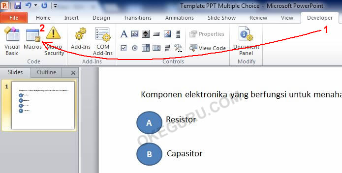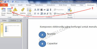 Sebelum memulai langkah pertama, pastikan menu Developer sudah diaktifkan, jika belum cara dapat dilihat pada Cara Menamplkan Menu Developer Microsoft Power Point 2010.