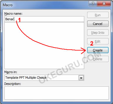 Selanjutnya akan ditampilkan form pembuatan macro seperti di bawah ini. Isi Macro name: dengan teks Benar kemudian klik Create.