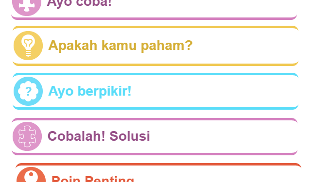 Liburan kali ini menyepatkan untuk membagi trik pengelolaan tampilan kelas maya di LMS nya SMKN 1 Cimahi. Biar keliatan kece dan tampil menarik, maka tampilan kelas maya harus diberikan ornamen warna dan icon penunjuk informasi. Hasilnya jadilah beberapa icon penunjuk informasi seperti gambar di atas dan buat hasil tempelan icon petunjuk dapat dilihat disini.